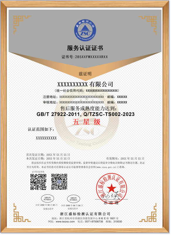 GB/T 27922-2011, Q / TZSC-TS002-2023 售后服務(wù)成熟度認證證書(shū)樣本:
