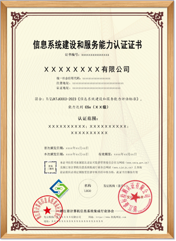 T/ZJXTJC 003—2023 信息系統建設和服務(wù)能力認證證書(shū)樣本: