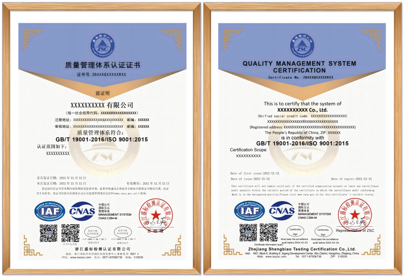質(zhì)量管理體系(ISO 9001)認證證書(shū)樣本: