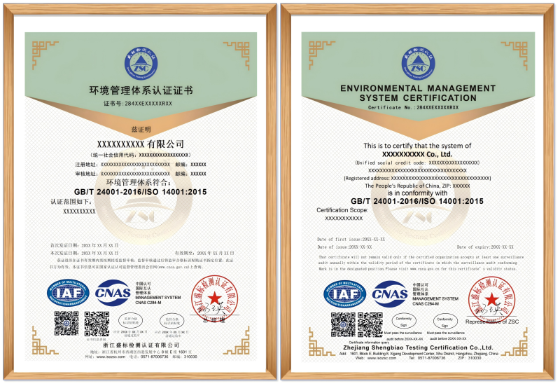 環(huán)境管理體系(ISO 14001)認證證書(shū)樣本: