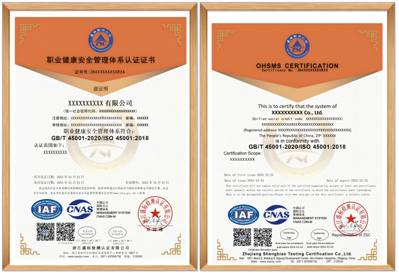 職業(yè)健康安全管理體系(ISO 45001)認證證書(shū)樣本: