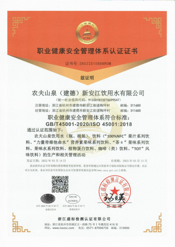 農夫山泉(建德)新安江飲用水有限公司{主營(yíng):農夫山泉飲用水(瓶、桶裝)、飲料(“100%NFC”果汁系列飲料、“力量帝維他命水”營(yíng)養素果味系列飲料、“茶π”果味系列飲料、果味水系列飲料、植物蛋白飲料、咖啡(類(lèi))飲料、“TOT”風(fēng)味飲料)}、農夫山泉(建德)新安江飲料有限公司{主營(yíng):農夫山泉飲料[瓶(桶)裝飲用水、茶飲料類(lèi)、果汁蔬菜類(lèi)、其他飲料類(lèi)-氣泡蘇打水]}、農夫山泉杭州千島湖飲用水有限公司{主營(yíng):農夫山泉包裝飲用水(飲用天然水)、運動(dòng)飲料}、農夫山泉浙江千島湖有限公司{主營(yíng):農夫山泉瓶(桶裝)飲用水(飲用天然水)、果汁及蔬菜汁類(lèi)飲料、運動(dòng)飲料},先后取得盛標認證頒發(fā)的職業(yè)健康安全管理體系認證證書(shū)。在此一同表示祝賀!