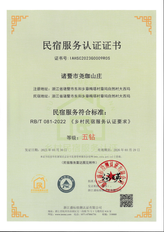 紹興首家!熱烈祝賀:諸暨市堯珈山莊獲得紹興地區首家鄉村民宿服務(wù)認證五鉆級證書(shū)!