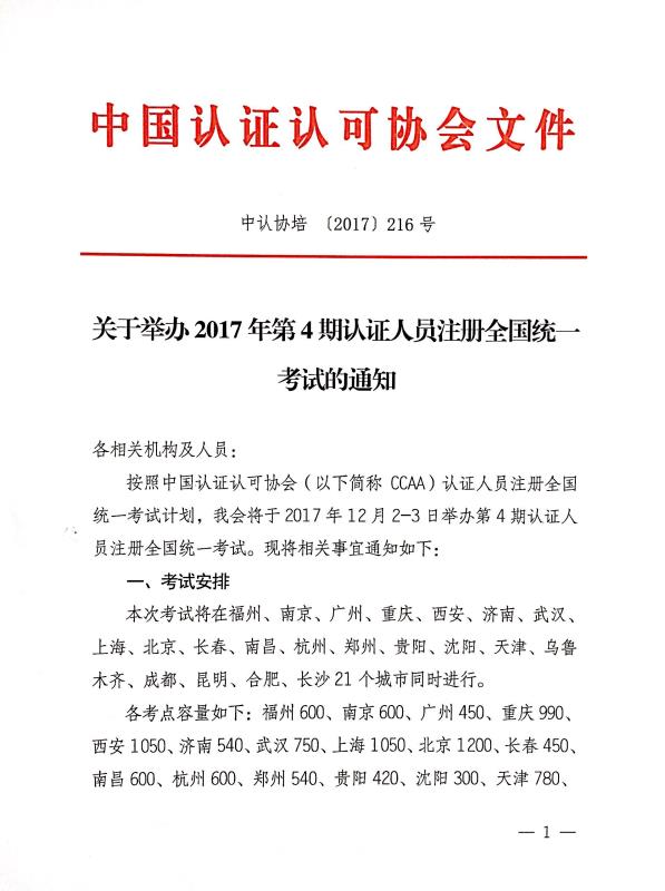中國認證認可協(xié)會(huì )于2017年10月30日發(fā)布《關(guān)于舉辦2017年第4期認證人員注冊全國統一考試的通知》,以下為文件詳細內容: